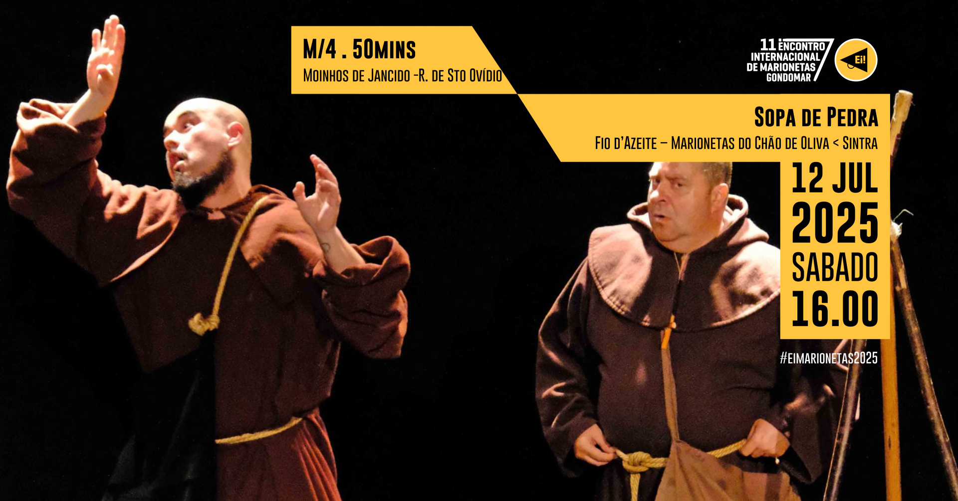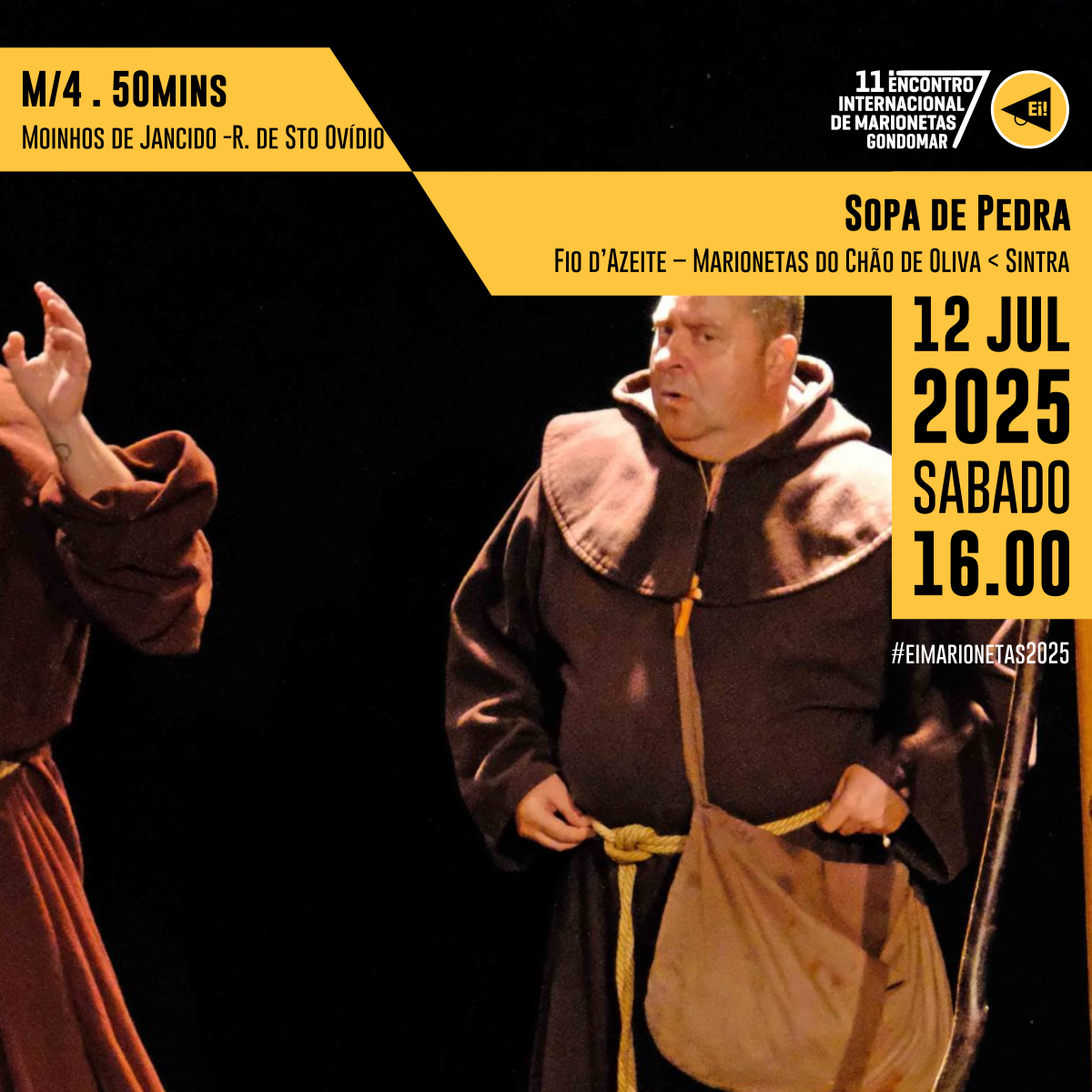 Apresenta-se no Ei! Marionetas, uma criação que nos remete para os entremezes, contadores de histórias, aqui sob a forma de frades franciscanos. A história da sopa da pedra é uma narrativa simbólica, uma metáfora, amplificada em cena para transformar uma simples história tradicional em todo o universo de diálogos com o público, onde os objetos adquirem uma dimensão ampliada, dada pela interpretação dos atores.